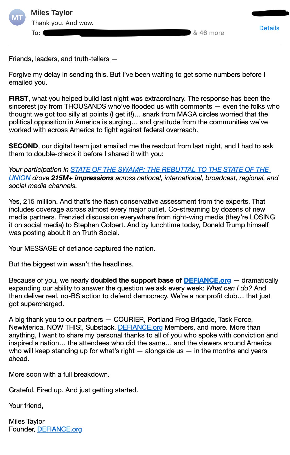 Why does all of this matter? Because our impact is growing. Far and wide. And our efforts to counter Trump’s abuses of power — and defend our rights — are getting stronger. I’ll share more details with you tomorrow and in the days ahead. Right now, I literally have to go let the dog out and spend some time with my family (it was a VERY busy few weeks leading up to this).